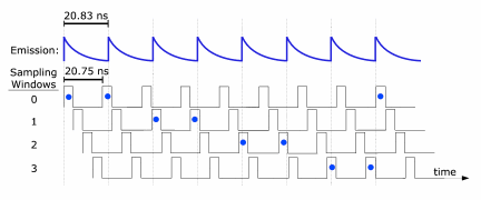Rather than precisely identifying the arrival time of each photon, the actual goal of lifetime acquisition is to precisely identify the fluorescence lifetimes from a distribution of photons. Following this principle, the DFD approach resolves each photon to within a digital sampling window, and uses heterodyning to ensure even sampling of the lifetime response. It was shown that this approach yields a phasor precision equivalent to TCSPC, but without dead times, and with inexpensive components which allow lifetime measurements in many independent channels.